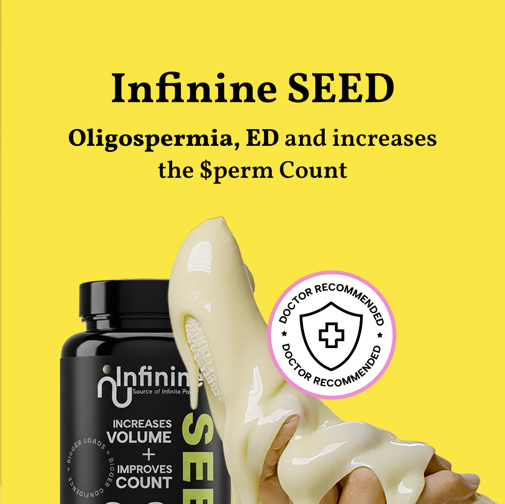 Infinine Seed: Enriched with 40mg Zinc & 12 potent herbs, it enhances fertility, sperm quality & volume, increase testosterone, while supporting reproductive health and confidence.